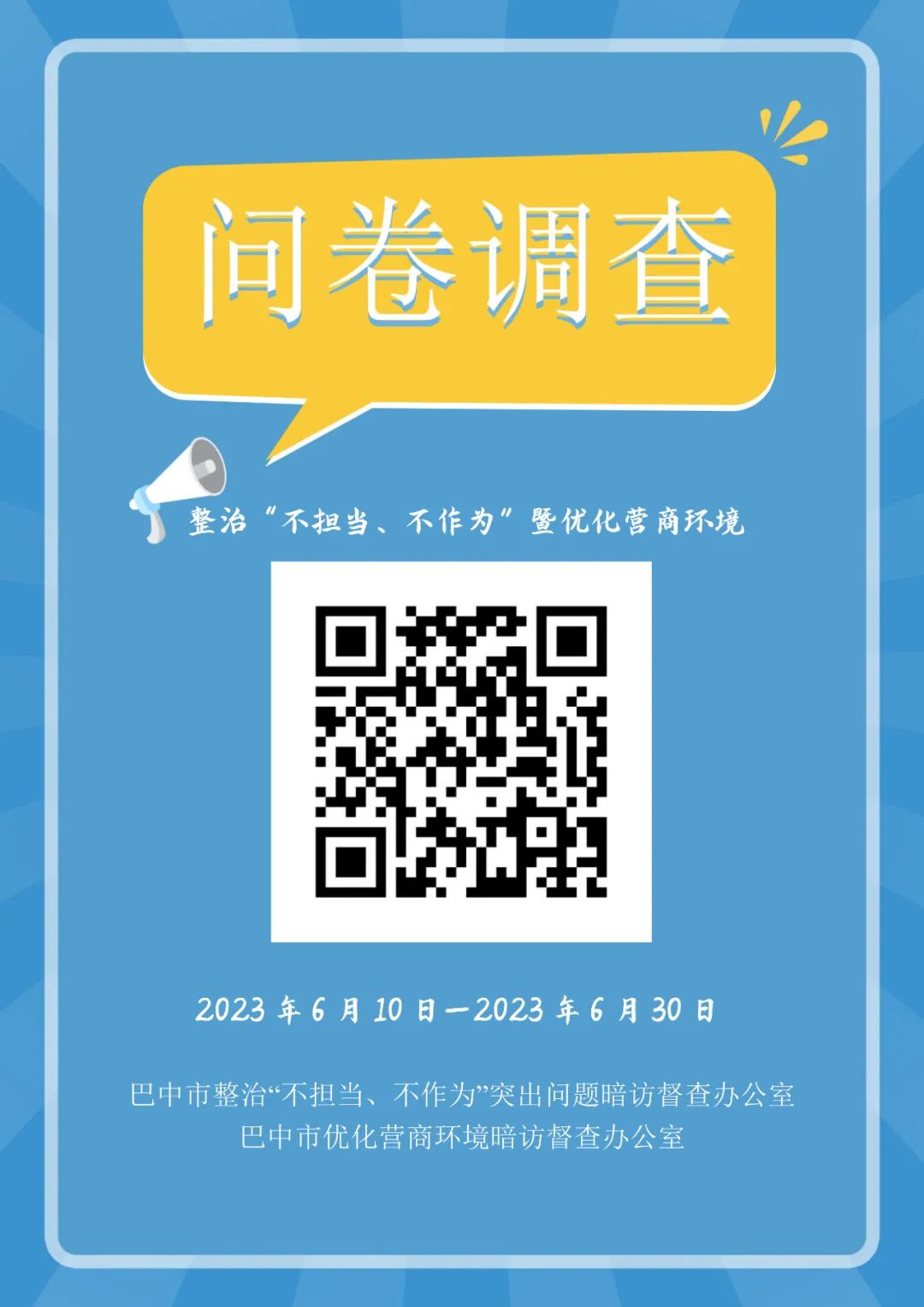 為深入整治“不擔(dān)當(dāng)、不作為”突出問題,更好地了解全面從嚴(yán)治黨、決策部署落實(shí)、優(yōu)化營(yíng)商環(huán)境、推動(dòng)鄉(xiāng)村振興、保障民生改善、防范化解風(fēng)險(xiǎn)等方面的情況,以及廣大干部群眾和企業(yè)對(duì)干事創(chuàng)業(yè)環(huán)境的切身感受,按照市委、市政府工作安排,巴中市整治“不擔(dān)當(dāng)、不作為”突出問題暗訪督查辦公室、巴中市優(yōu)化營(yíng)商環(huán)境暗訪督查辦公室決定開展整治“不擔(dān)當(dāng)、不作為”突出問題暨優(yōu)化營(yíng)商環(huán)境網(wǎng)絡(luò)問卷調(diào)查,調(diào)查時(shí)間為2023年6月10日至6月30日。