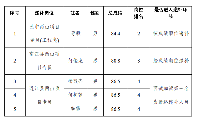 根據(jù)《巴中發(fā)展控股集團有限公司公開招聘工作人員公告》有關(guān)規(guī)定,經(jīng)集團招聘工作領(lǐng)導小組專題會議研究決定,對巴中發(fā)展控股集團有限公司2024年公開招聘工作人員體檢環(huán)節(jié)中出現(xiàn)缺額的崗位按成績進行順位遞補,并對個別崗位考試分數(shù)相同的遞補人員進行面試加試。現(xiàn)將有關(guān)事項公告如下: