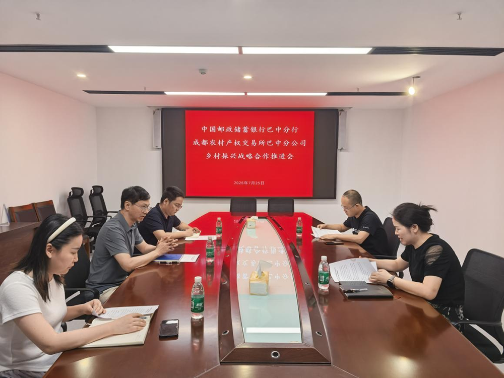 為充分發(fā)揮成都農交所四川省農村產權綜合交易平臺優(yōu)勢和郵儲銀行融資及其他綜合金融服務優(yōu)勢,通過資源互補、信息互通、協(xié)作配合,共同推進服務農村集體經(jīng)濟組織和新型農業(yè)經(jīng)營主體的金融支農工作。2025年7月25日下午,中國郵政儲蓄銀行巴中分行與成都農村產權交易所巴中分公司、巴中市鑫匯農業(yè)服務有限公司召開了鄉(xiāng)村振興戰(zhàn)略合作推進會。